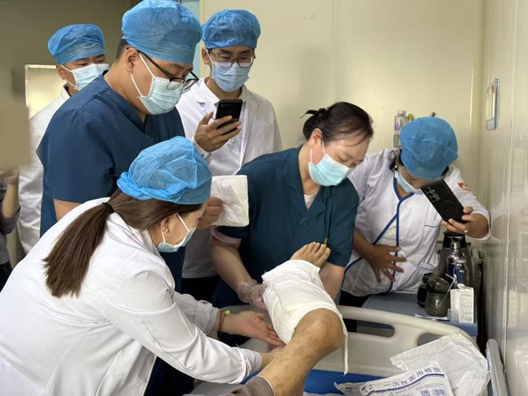 下午,訪問團(tuán)的成員們分批進(jìn)入手術(shù)室,參觀并參與清創(chuàng)、微粒皮種植等手術(shù),每一個(gè)操作細(xì)節(jié)的展示都幫助他們將理論知識(shí)與實(shí)際操作深度結(jié)合,有效提升了其對(duì)再生醫(yī)療技術(shù)相關(guān)手術(shù)操作規(guī)范的理解與掌握程度,為今后在本國(guó)開展同類手術(shù)積累了關(guān)鍵的實(shí)踐經(jīng)驗(yàn)。觀摩活動(dòng)結(jié)束之后,燒傷整形與創(chuàng)面修復(fù)科的醫(yī)生們繼續(xù)帶來(lái)了燒傷再生醫(yī)療技術(shù)治療壞死性筋膜炎、燒傷再生醫(yī)療技術(shù)救治糖尿病足臨床實(shí)踐效果的經(jīng)驗(yàn)分享,并在分享結(jié)束后與蒙古國(guó)的醫(yī)護(hù)就兩國(guó)在再生醫(yī)療技術(shù)上的差異和不同經(jīng)驗(yàn)展開了深入交流。通過對(duì)比兩國(guó)在患者體質(zhì)、診療環(huán)境、醫(yī)療資源配置等方面的差異,共同探討了技術(shù)本土化調(diào)整的可行路徑,為再生醫(yī)療技術(shù)在蒙古國(guó)的優(yōu)化提供了重要參考。