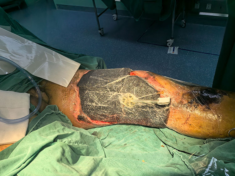 10月10日,應(yīng)長治市人民醫(yī)院急診邀請,《中國燒傷創(chuàng)瘍雜志》常務(wù)編委、燒傷創(chuàng)瘍再生醫(yī)療技術(shù)臨床專家趙瑞慶,會診一例裝載機碾軋傷工人。次日在全麻下行雙下肢大腿內(nèi)側(cè),外側(cè)壞死組織清創(chuàng)術(shù),事后使用vsd裝置,術(shù)后制定了詳細的治療方案。