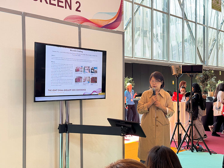 除展臺的展示外,再生醫(yī)療技術更是在會議中掀起一次次學術浪潮。大會首日下午,題為“重塑創(chuàng)面治療:從臨床實踐到技術創(chuàng)新”的再生醫(yī)療技術研討會順利召開。作為推動克林頓全球倡議(CGI)——“歐洲修復計劃:賦能歐洲再生醫(yī)療網絡構建”的又一關鍵活動,研討會圍繞再生醫(yī)療技術在急慢性創(chuàng)面中的創(chuàng)新應用展開討論。來自沙特 Sulaiman Al Habib醫(yī)療集團外科的Ziad Dalloul首先分享了馬喬林潰瘍的臨床管理策略,深入探討了再生醫(yī)療技術在復雜創(chuàng)面中的應用及優(yōu)勢。隨后,西安市第九醫(yī)院燒傷整形科周小茜帶來了應用自創(chuàng)微粒皮漿種植結合再生醫(yī)療技術治療慢性創(chuàng)面的演講,充分展示了該技術在促進慢性創(chuàng)面愈合中的優(yōu)勢。最后,來自菲律賓Quirino Memorial醫(yī)療中心燒傷科的Nikki Valencia分享了一項最新的系統回顧,全面證實了再生醫(yī)療技術在燒傷治療中的綜合療效、安全性、疼痛緩解及感染預防方面的顯著療效。