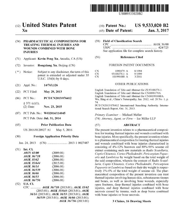 2017年1月3號(hào),徐榮祥教授“治療熱力損傷、創(chuàng)傷合并骨損傷的藥物組合物”獲得美國專利授權(quán),專利號(hào)US 9,533,020 B2。