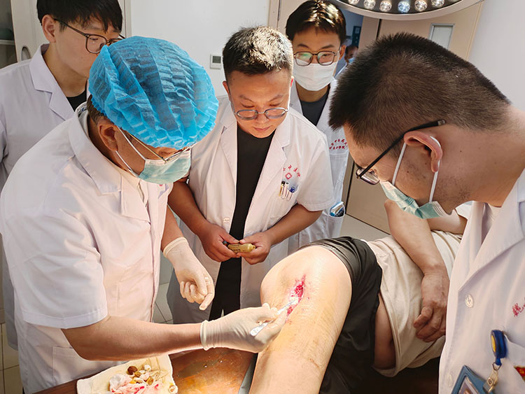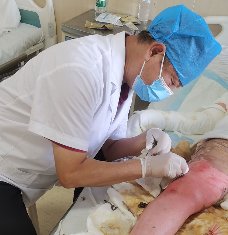8月18日,應(yīng)河北魏縣中醫(yī)醫(yī)院之邀,再生醫(yī)學(xué)知名專家、《中國燒傷創(chuàng)瘍雜志》常務(wù)編委趙瑞慶主任,在該院會(huì)診了三例創(chuàng)面患者(下肢外傷皮膚深部感染、腦出血合併巨大壓瘡、肢體多部位瀝青燒傷),并親自演示了操作程序,在討論環(huán)節(jié)提供了一對一的治療方法。